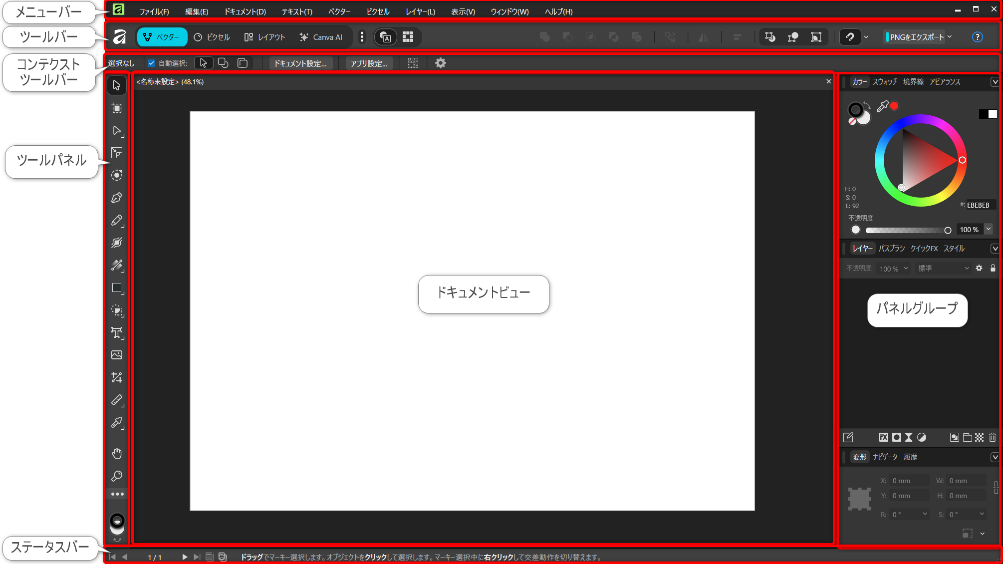 | パネルグループ | 各種設定操作を行うためのパネル群。分離や表示切替などが可能 |