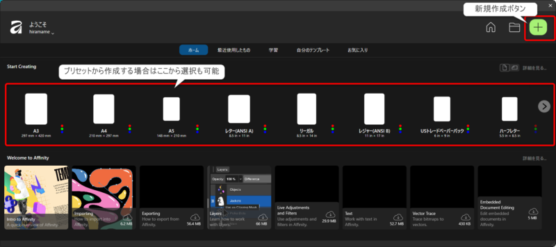 ① Affinityを起動後に表示される以下のウィンドウにて、右上の「+」ボタンをクリックします。