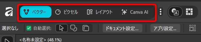 デフォルトではベクター、ピクセル、レイアウト、Canva AI の4つが表示されていますが、