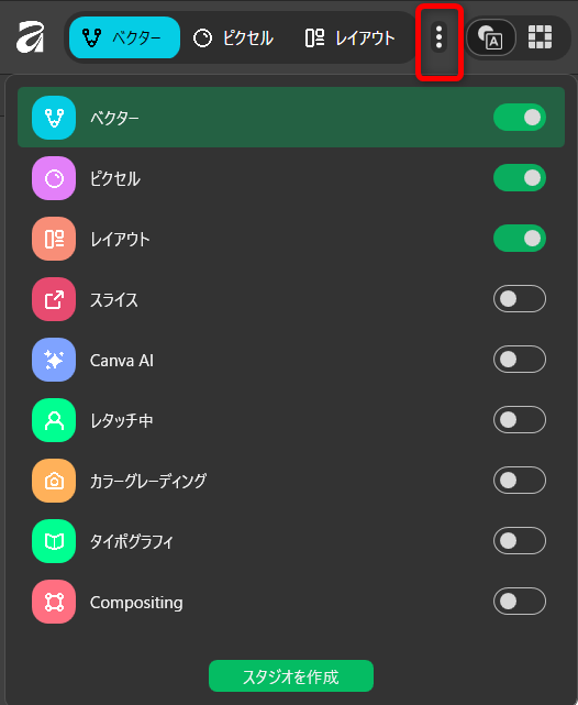 例:ベクター編集→ベクタースタジオ、ラスター編集→ピクセルスタジオ、出版/印刷用編集→レイアウトスタジオ