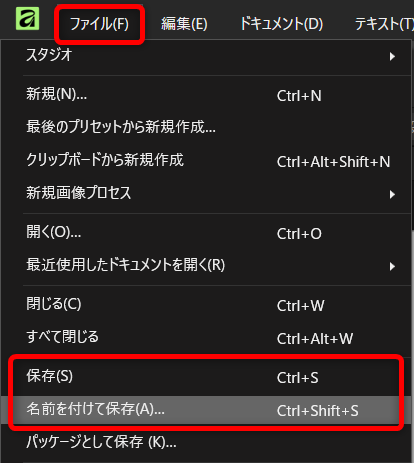 作成したドキュメントは、Ctrl+S または メニューバー:「ファイル」>「名前を付けて保存」から保存が可能です。