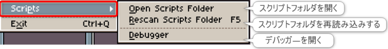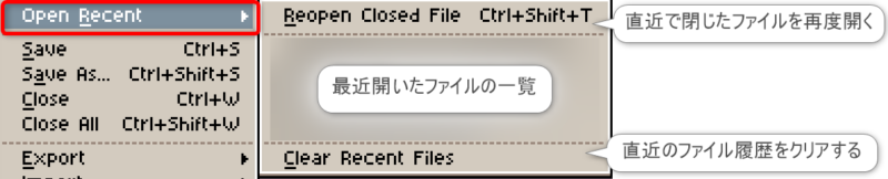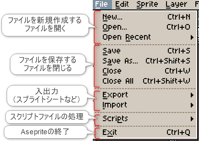 項目「File」は、主に作業ファイルやスクリプトファイルの入出力に関する機能にアクセスできます。