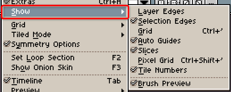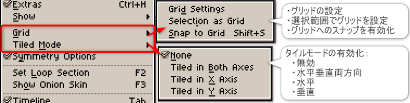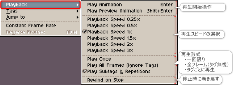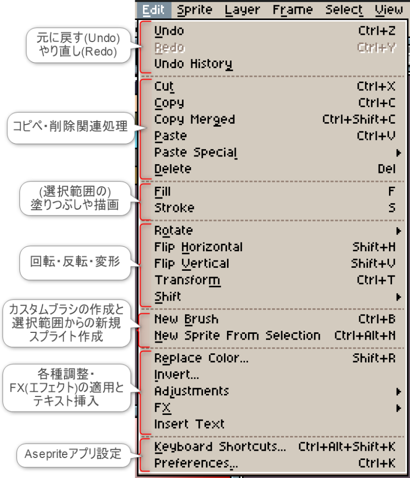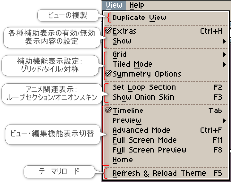 各機能の活用方法や詳細は割愛しますが、Asepriteに存在する機能をざっくり把握する参考にお役立てください。