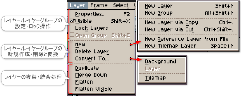 項目「Layer」は、主にレイヤーやレイヤーグループの操作や編集に関する機能にアクセスできます。