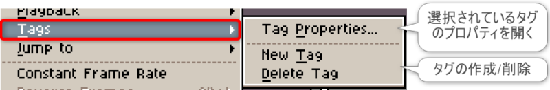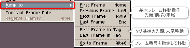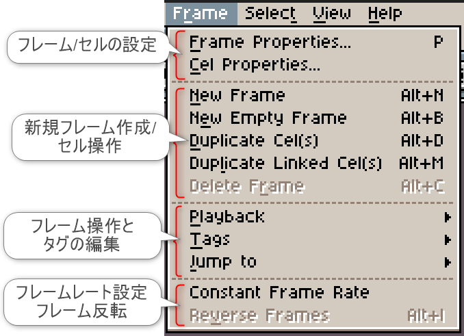 項目「Frame」は、主にフレームやセル操作の他、アニメーションの再生オプションに関する機能にアクセスできます。