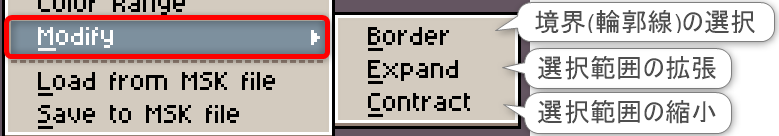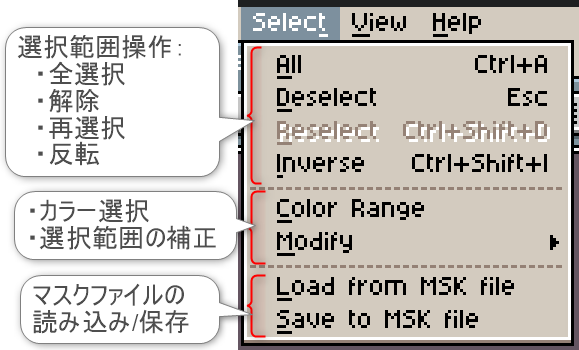 項目「Select」は、主に選択の関連操作や補正、マスクファイルに関する機能にアクセスできます。
