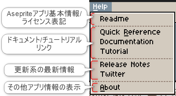 項目「Help」は、Asepriteのアプリ情報やドキュメントのリンクにアクセスできます。