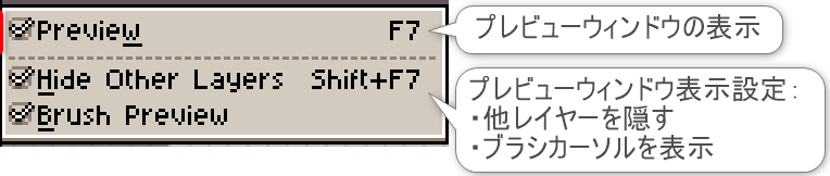 | Preview | プレビューウィンドウの表示と設定 設定で、表示レイヤーの制限やブラシの表示を切り替え可能 ![]() ![]() | ![]() ![]() |