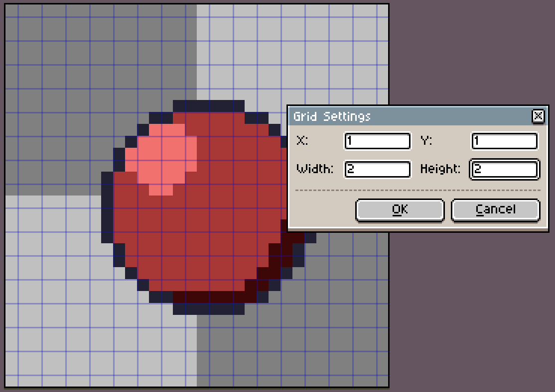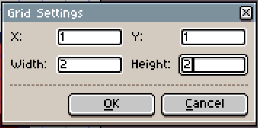| Grid Settings | 表示するグリッドの幅/高さとXYオフセットを設定します。 以下は、X,Y軸に1ピクセルのオフセットをもつ、幅/高さ2ピクセルの表示設定です ![]() ![]() | ![]() ![]() |