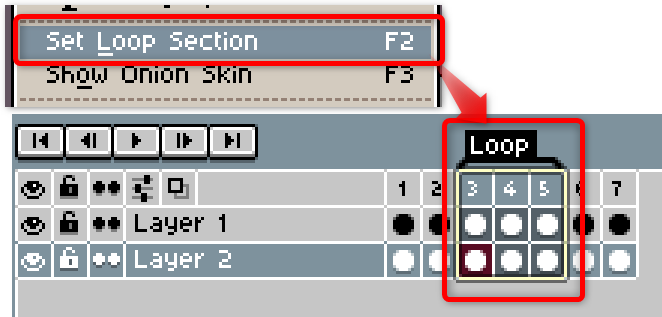 メニューバー: View >Set Loop Section では、選択したフレームにループセクション(タグ)を設定できます。