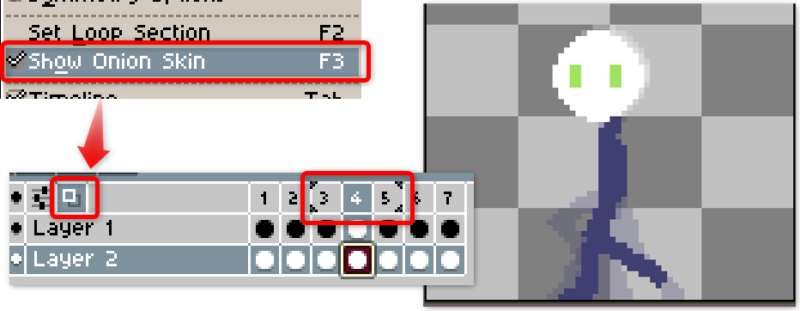 メニューバー: View >Show Onion Skin では、オニオンスキンの表示/非表示を切り替えることができます。