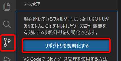 VSCodeサイドバーからソース管理タブを開き「リポジトリを初期化する」をクリックします。