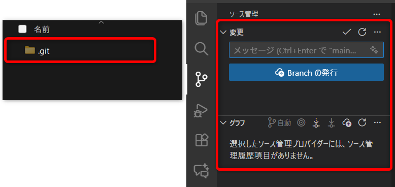 ソース管理タブの表示が変化し、エクスプローラーで確認すると.gitフォルダが作成されていることを確認できます。(隠しファイル表示の有効化が必要)