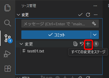 「変更」欄右側の「+」ボタンからすべての変更をステージ出来ます。(個別も可能)