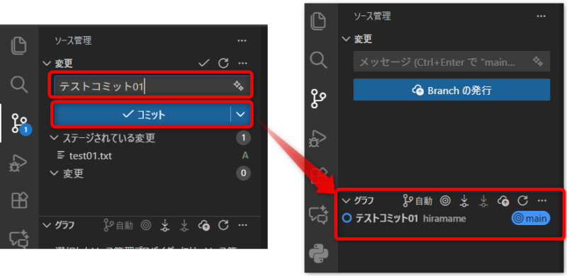 コミットする履歴をステージ後、コミットメッセージを入力して「コミット」ボタンをクリックすることでコミットが実行されます。