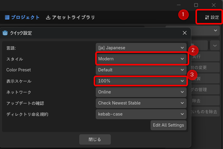 エディタのスタイルはGodot4.6を起動し、以下の手順で操作します。