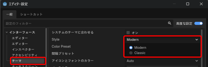 Godot4.5 → 4.6の更新で、デフォルトのエディタテーマとして「Modern」が適用されるようになりました。