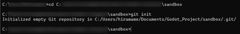 cd <プロジェクトフォルダのパス>プロジェクトフォルダに移動後、git init でローカルリポジトリを作成します。