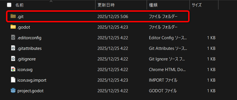 git init 後、プロジェクトフォルダに「.git」フォルダ(=ローカルリポジトリ)が作成されていることを確認できます。