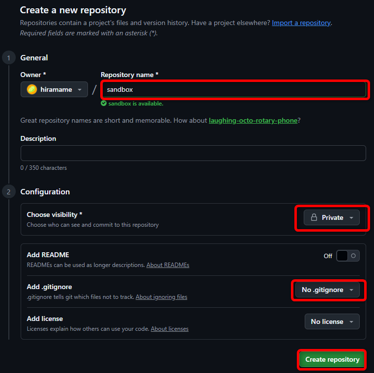 リポジトリ名や公開範囲(Public/Private)を設定し、新規リモートリポジトリを作成します。
