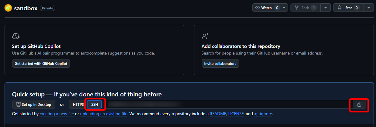 作成したリモートリポジトリの画面で、上部にあるクイックセットアップからボタン「SSH」を選択後、