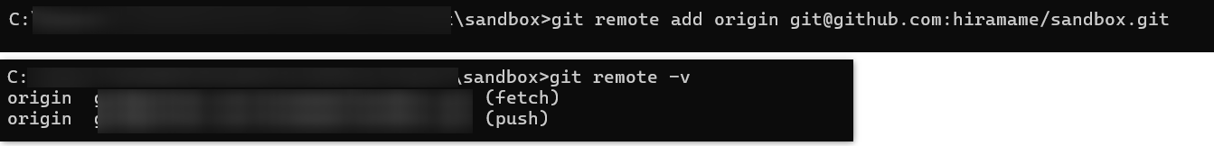 git remote add origin <コピーしたアドレス>また、git remote -v でリモートリポジトリの登録状況(リモートリポジトリ名と場所)を確認できます