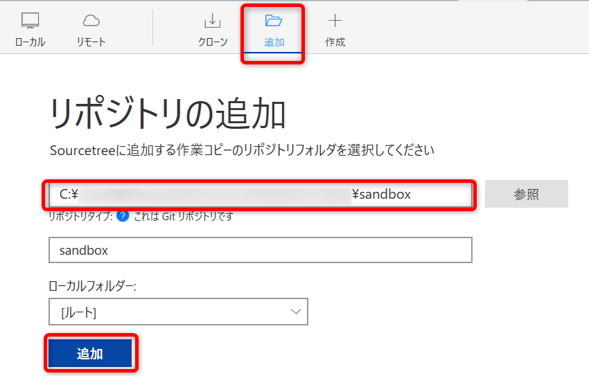 Sourcetree で作成したリポジトリを開く際は「追加」ボタンからプロジェクトディレクトリを参照します。