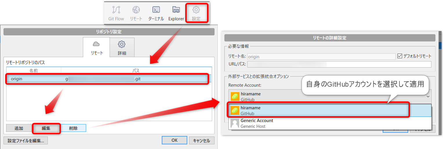 初期状態ではリモートアカウントの設定が必要なため、右上の「設定」ボタンから以下のように対応します。