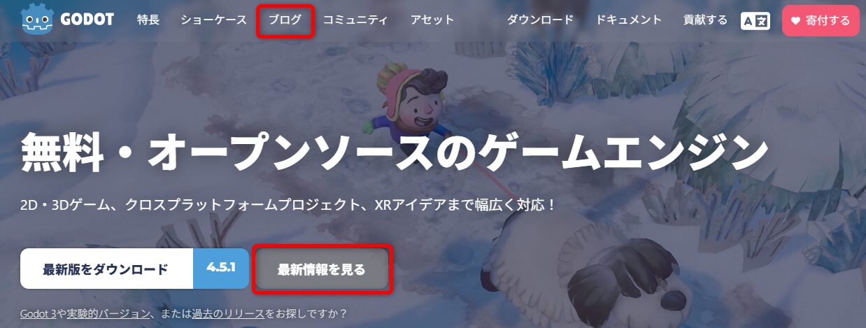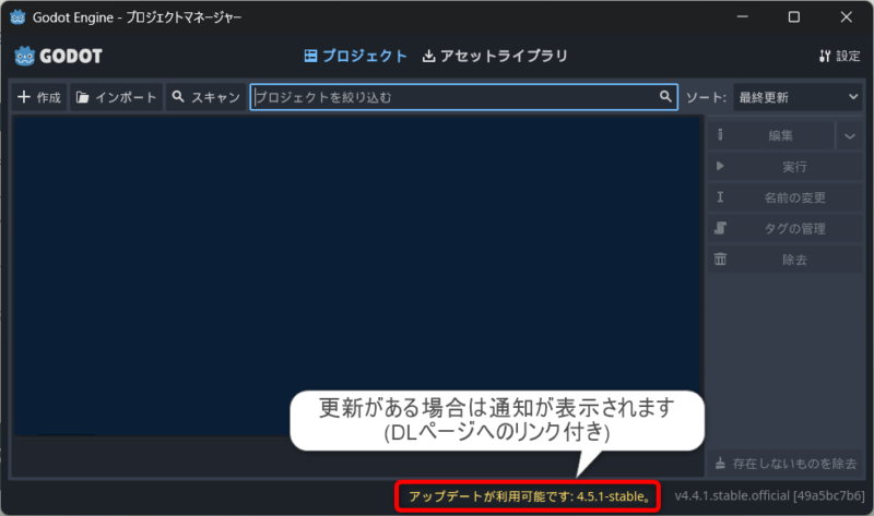 Godotバージョンの更新有無は、公式ページ や Godot起動画面(プロジェクトマネージャー)右下の通知から確認ができます。
