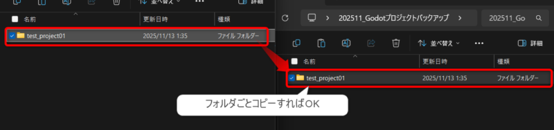 Godotの場合、プロジェクトはフォルダで管理されているため、コピー&ペーストで別の場所に複製すればOKです。