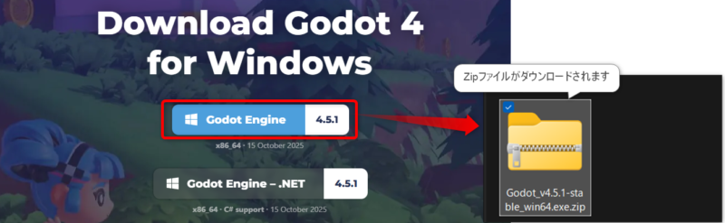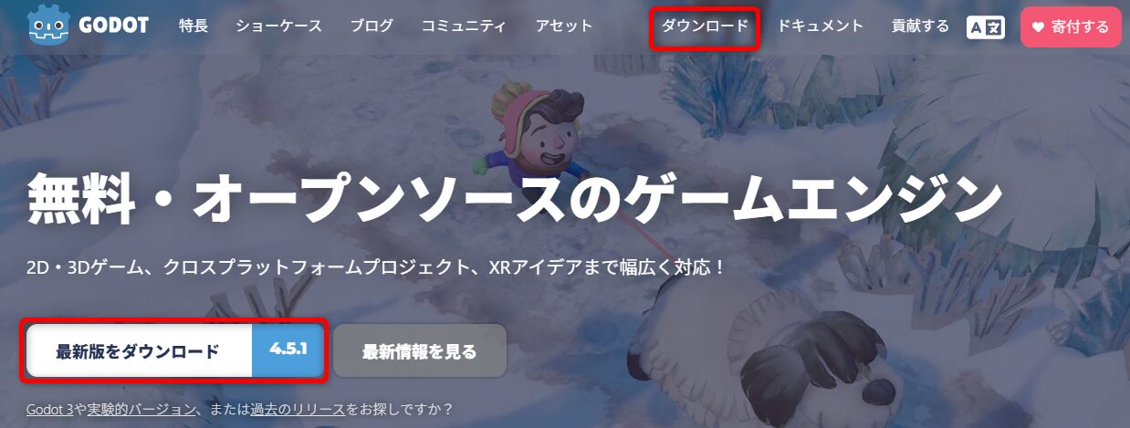 Godotの公式ページから、新バージョンのGodot本体をダウンロードします。(最新版をダウンロードから対応ページへ遷移)