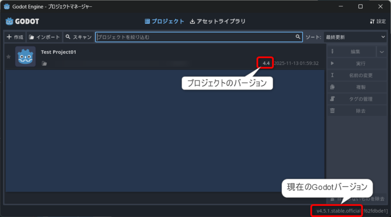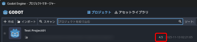 開いたプロジェクトマネージャーの右下で、現在のGodotバージョンが更新後のものになっていることを確認できます。