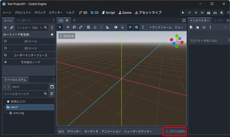 以下のようにエディタ画面が開けば、Godotエディタとプロジェクトの更新は完了です。
