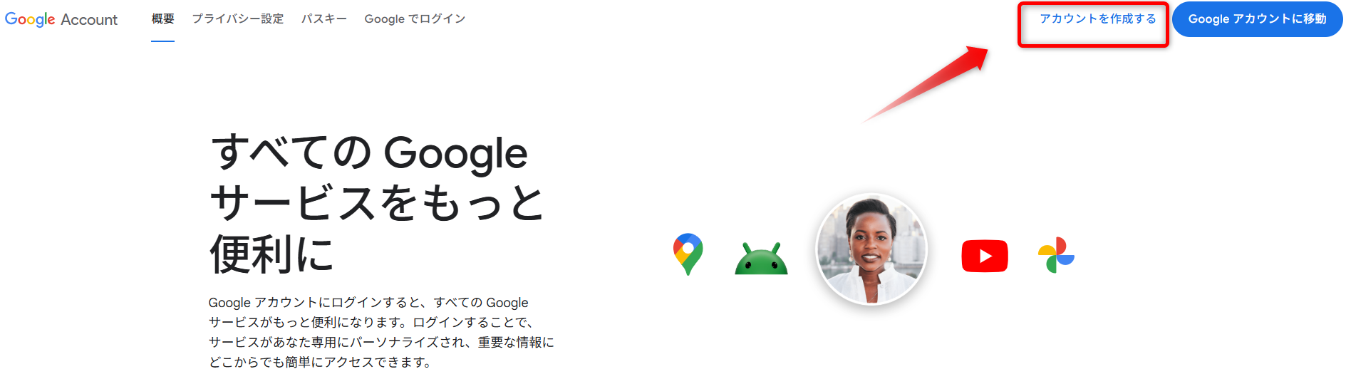 Googleアカウントページにアクセスし、右上の「アカウントを作成」をクリック