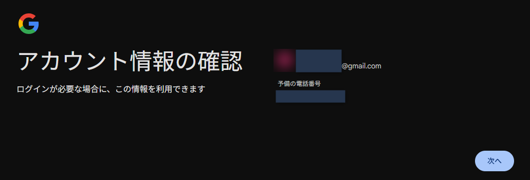 ⑩ アカウント情報の確認:問題が無ければ「次へ」