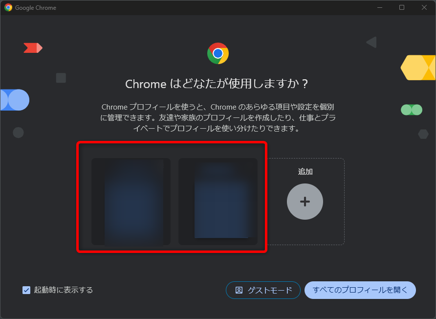 複数プロフィールがある場合、chromeの起動時にどのプロフィールで起動するかの確認が発生するようになります。
