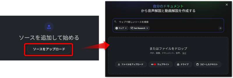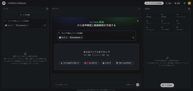 ソースは、ノートを開いた時に中央のチャットに表示されている「ソースをアップロード」からアクセスします。