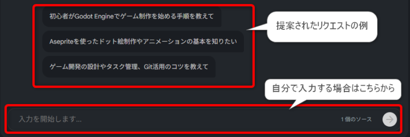 チャット欄の下部には次のアクションのおすすめも表示されますが、自分でAIにリクエストの文章を送ることもできます。
