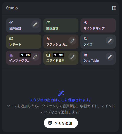 エディタ右側にあるスタジオ(Studio) では、追加したソースを基にした各種補助機能の利用ができます。