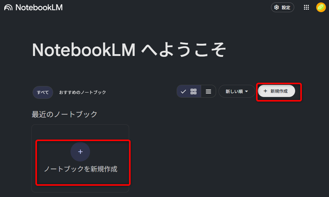 2. トップページの「新規作成」または「ノートブックを新規作成」ボタンをクリックしてノートを開きます。